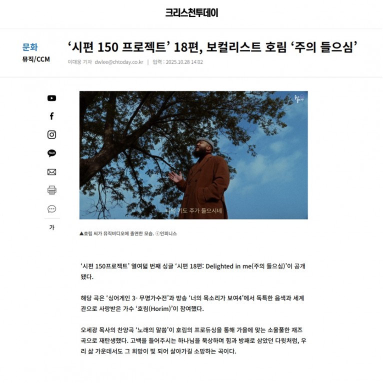 뮤직타임 [기사] ‘시편 150 프로젝트’ 18편, 보컬리스트 호림 ‘주의 들으심’(크리스천투데이)