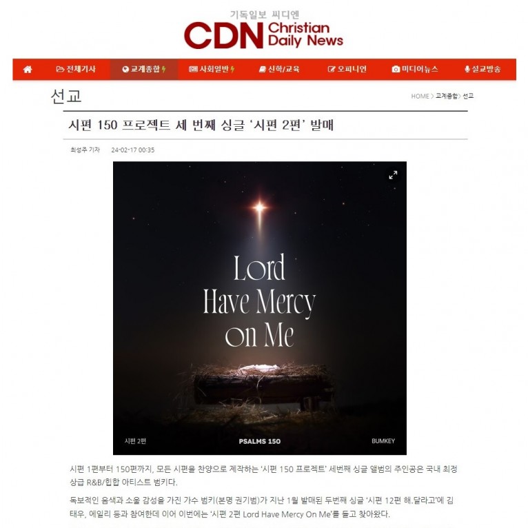 뮤직타임 [기사] 시편 150 프로젝트 세 번째 싱글 ‘시편 2편’ 발매(기독일보 씨디엔)