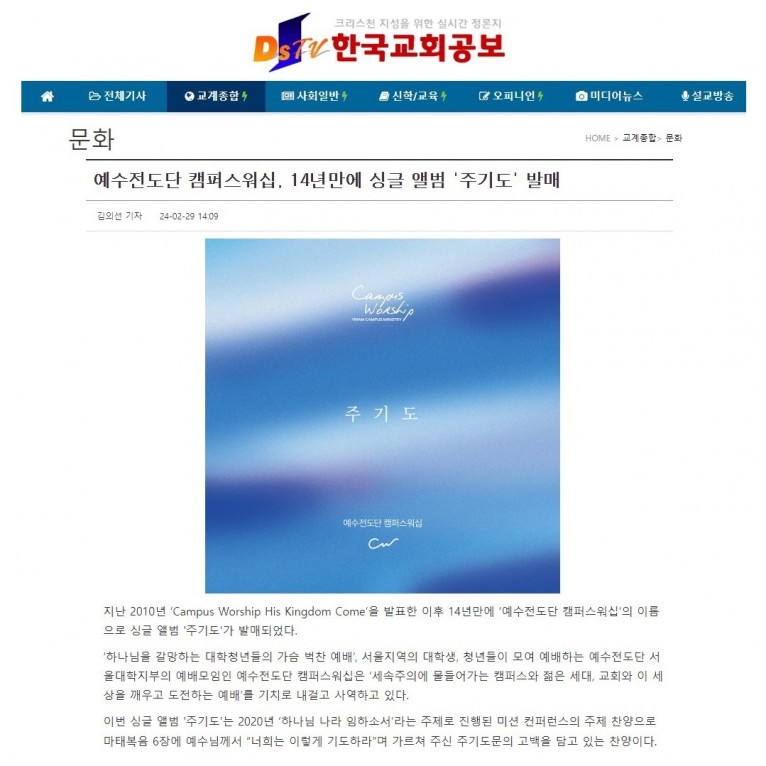 뮤직타임 [기사] 예수전도단 캠퍼스워십, 14년만에 싱글 앨범 '주기도' 발매(한국교회공보)
