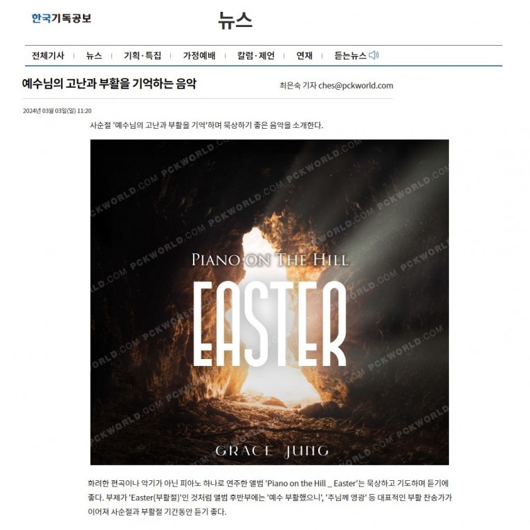 화려한 편곡이나 악기가 아닌 피아노 하나로 연주한 앨범 'Piano on the Hill _ Easter'는 묵상하고 기도하며 듣기에 좋다. 부제가 'Easter(부활절)'인 것처럼 앨범 후반부에는 '예수 부활했으니', '주님께 영광' 등 대표적인 부활 찬송가가 이어져 사순절과 부활절 기간동안 듣기 좋다.