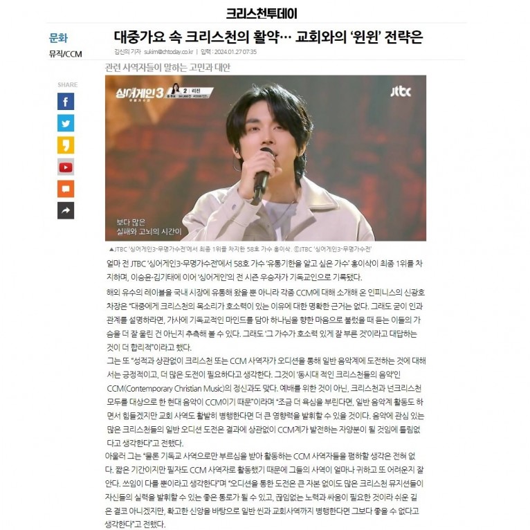 [기사] 대중가요 속 크리스천의 활약… 교회와의 ‘윈윈’ 전략은(크리스천투데이)