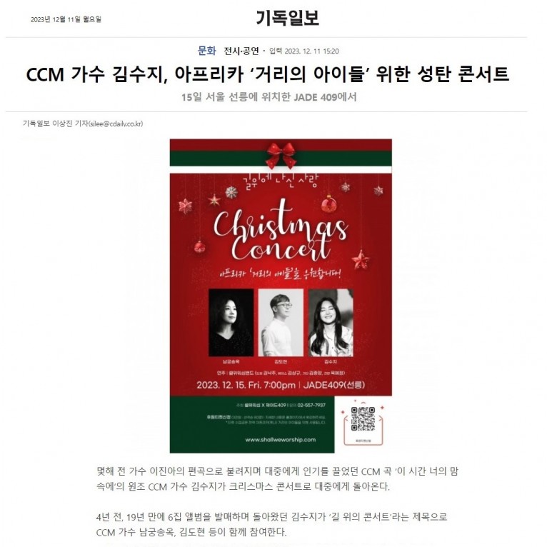 [기사] CCM 가수 김수지, 아프리카 ‘거리의 아이들’ 위한 성탄 콘서트(기독일보)