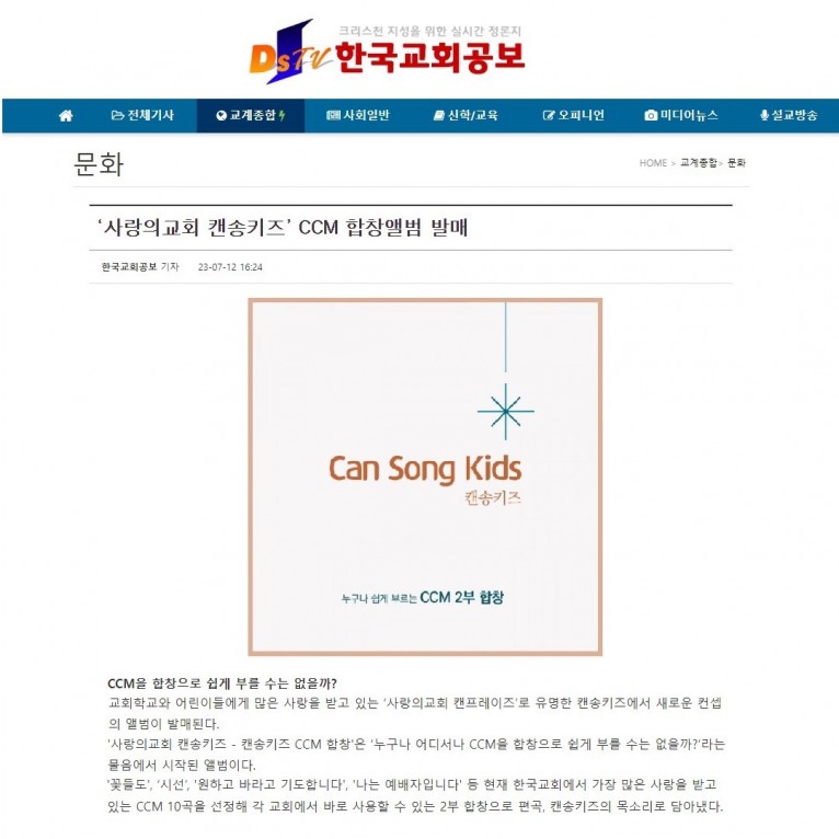 뮤직타임 [기사] ‘사랑의교회 캔송키즈’ CCM 합창앨범 발매(한국교회공보)