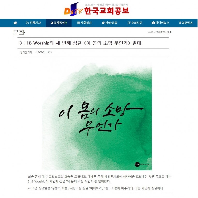 뮤직타임 [기사] 3:16 Worship의 세 번째 싱글 <이 몸의 소망 무언가> 발매(한국교회공보)