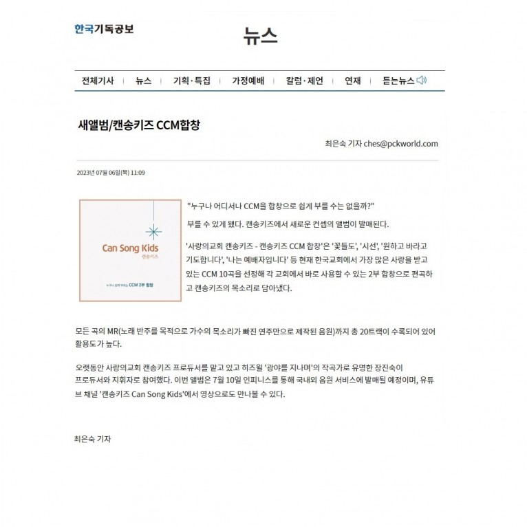 뮤직타임 [기사] 새앨범 캔송키즈 CCM합창(한국기독공보)