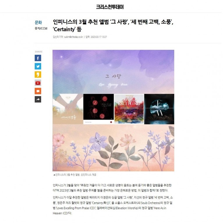 이경은의 ‘그 사랑’은 “넘어진 나를 일으켜 고난 가운데 손 내밀어 잡아주시네 그 사랑 크고 깊으신 그 사랑 나 찬양하리 내 삶이 끝날 때까지”라고 고백하는 찬양으로, 이경은의 첫 싱글 앨범이기도 하다. ‘그 사랑’은 이신희, 이철규 등 헤리티지 멤버들이 참여했다. 인피니스는 “부족한 자신을 있는 그대로 품어 주시는 하나님의 사랑을 순수하고 담백한 보컬로 담담하게 고백한다”며 “커버 이미지 또한 봄에 잘 어울린다”고 전했다.