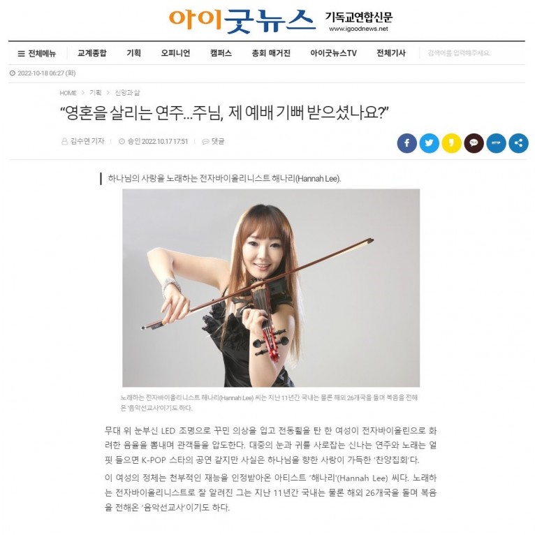 이 여성의 정체는 천부적인 재능을 인정받아온 아티스트 ‘해나리’(Hannah Lee) 씨다. 노래하는 전자바이올리니스트로 잘 알려진 그는 지난 11년간 국내는 물론 해외 26개국을 돌며 복음을 전해온 ‘음악선교사’이기도 하다.
