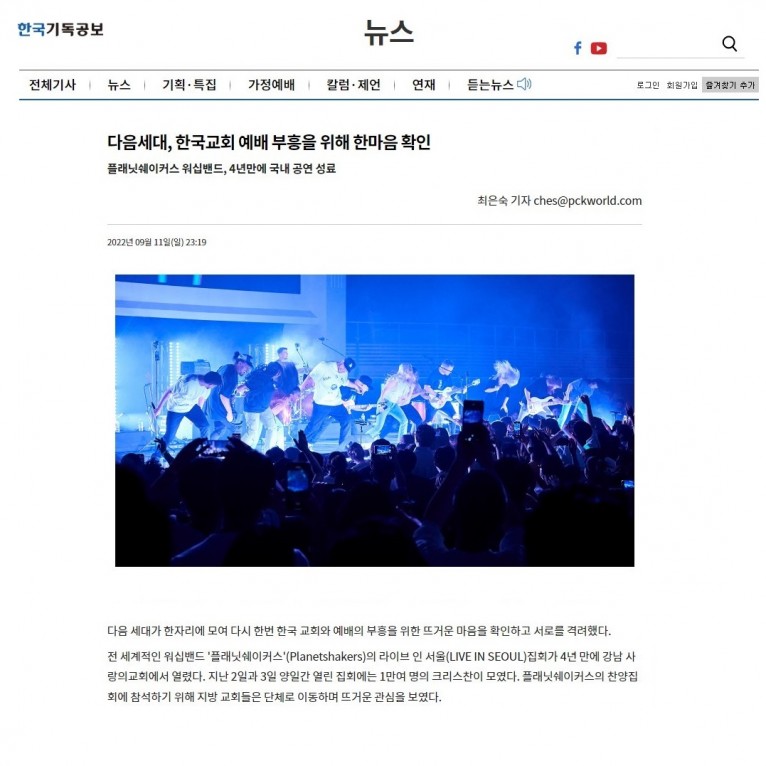 전 세계적인 워십밴드 '플래닛쉐이커스'(Planetshakers)의 라이브 인 서울(LIVE IN SEOUL)집회가 4년 만에 강남 사랑의교회에서 열렸다. 지난 2일과 3일 양일간 열린 집회에는 1만여 명의 크리스찬이 모였다. 플래닛쉐이커스의 찬양집회에 참석하기 위해 지방 교회들은 단체로 이동하며 뜨거운 관심을 보였다.