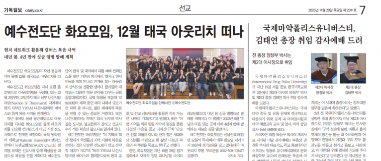 [기사] 예수전도단 화요모임, 12월 3일 태국으로 아웃리치(기독일보)