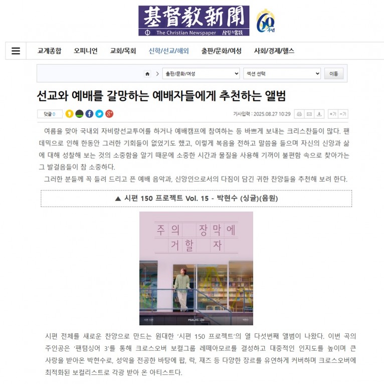 시편 전체를 새로운 찬양으로 만드는 원대한 ‘시편 150 프로젝트’의 열 다섯번째 앨범이 나왔다. 이번 곡의 주인공은 ‘팬텀싱어 3’를 통해 크로스오버 보컬그룹 레떼아모르를 결성하고 대중적인 인지도를 높이며 큰 사랑을 받아온 박현수로, 성악을 전공한 바탕에 팝, 락, 재즈 등 다양한 장르를 유연하게 커버하며 크로스오버에 최적화된 보컬리스트로 각광 받아 온 아티스트다.
